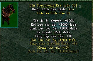 • Ngựa Bôn Tiêu Hoàng Kim : 1kxu + 100 HCTK + 100 mảnh ngựa + 30 Thủy Tinh + 30 THBT